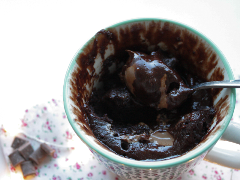 It’s very simple… whisk the dry ingredients together, add the oil and the milk and mix well. Pour into a smallish mug a plop the peanut butter on top. Stick it in the microwave for around 70 seconds, you might have to experiment a little depending on your microwave.