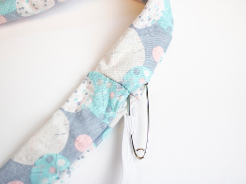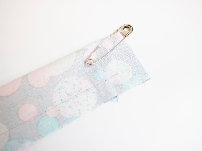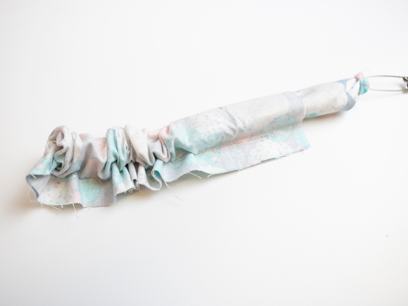 Pin the other end of the elastic to the fabric at the opening to stop it disappearing through the tube.