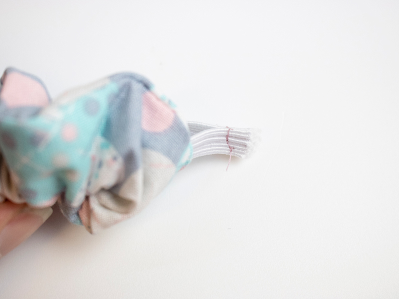 Pull the ends of the elastic away from the fabric. Overlap the ends slightly and stitch together.