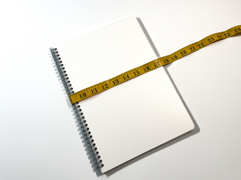 - Now we need to cut the fabric for our pocket pieces. The height will be the same as in step 1. To calculate the width, first open up your notebook and measure the width of one cover (mine is 8”). I’m going to work out approximately ⅔ of this (So 5”). Then I will double it (10”) and add 1 ¼” for seam allowance.