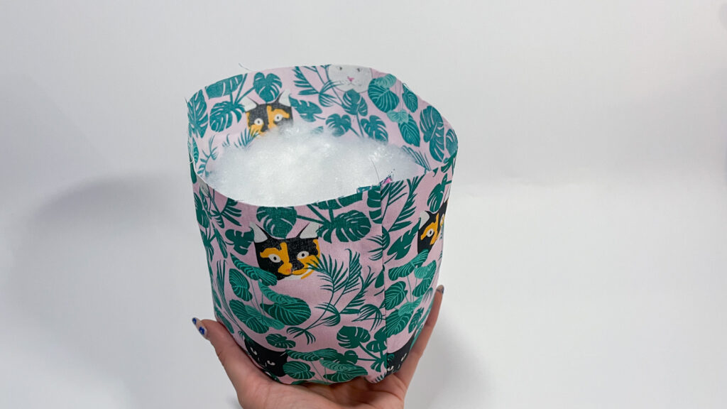 - Stuff with toy fill (or whatever you are using). You want it to be nice and plump! Keep going until the fill is about 2” from the top.