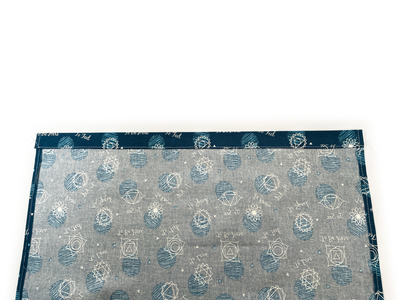 - Fold the top short edge over by ½” and press (wrong sides together), then turn by another ½” and press. Stitch along the bottom edge of the fold. This creates the channel for our drawstring.