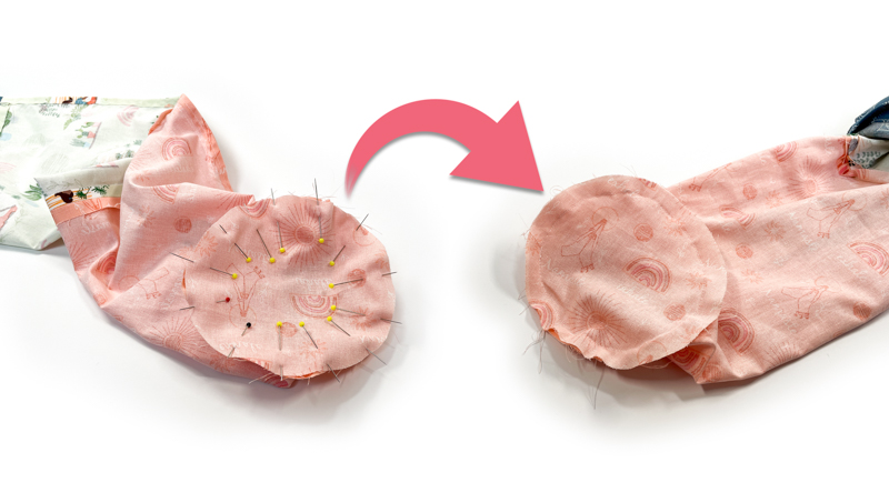 Use lots of pins to insert this into the bottom of your bag, right sides of fabric together, then stitch. Take your time. But also – don’t worry about it being perfect. It’s only the base of the bag, no-one will notice a few tucks or puckers!
