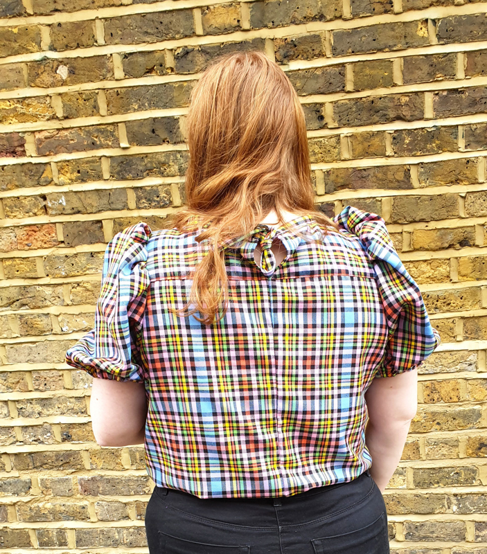 It’s a go-to pattern for me and a popular wardrobe staple, this is such a great blouse pattern. It has lots of little details that make it visually interesting, such as tie back, ruffle and very poufy sleeves! Being a short sleeved pattern meant I could just about cut it all out apart from the ruffle. I feel that it would have looked a little cluttered with it added so this wasn’t a hard sacrifice to make! I also cut the back piece as two pieces with a small seam and sewed them together in order to get it to fit, again, not something that particularly bothers me and luckily the stripy nature of the print hides it well!