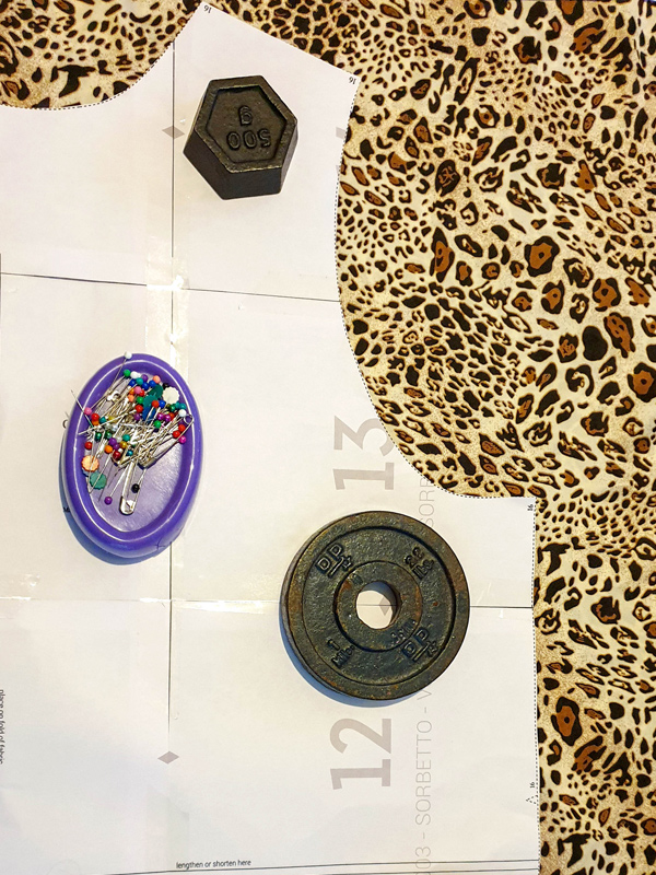 - Use all the weights when cutting out. Satin moves A LOT. In order to make sure you cut out your pattern pieces correctly, make sure you use lots of weights to hold the pieces in place. And all the pins. LOTS OF PINS! I would also recommend using a rotary cutter if possible, that way you are not lifting the fabric while cutting and potentially moving it out of place.