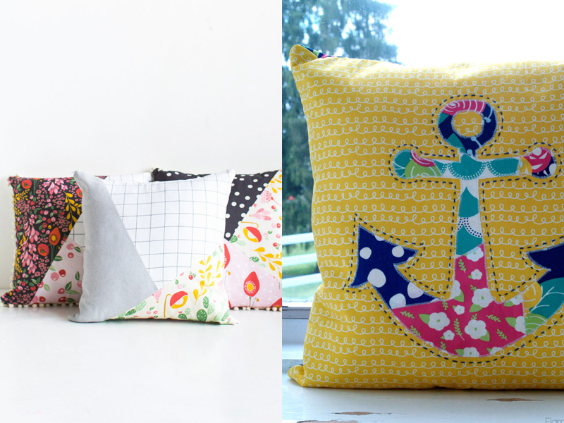 Sticking with the theme ‘Netflix and Sew’ this month, how about updating your cushions to up the comfy-factor whilst watching a new show. The first is this pattern blocked pillow with a lovely pom pom trim, and I love the appliqued anchor pillow which you could do with any design.