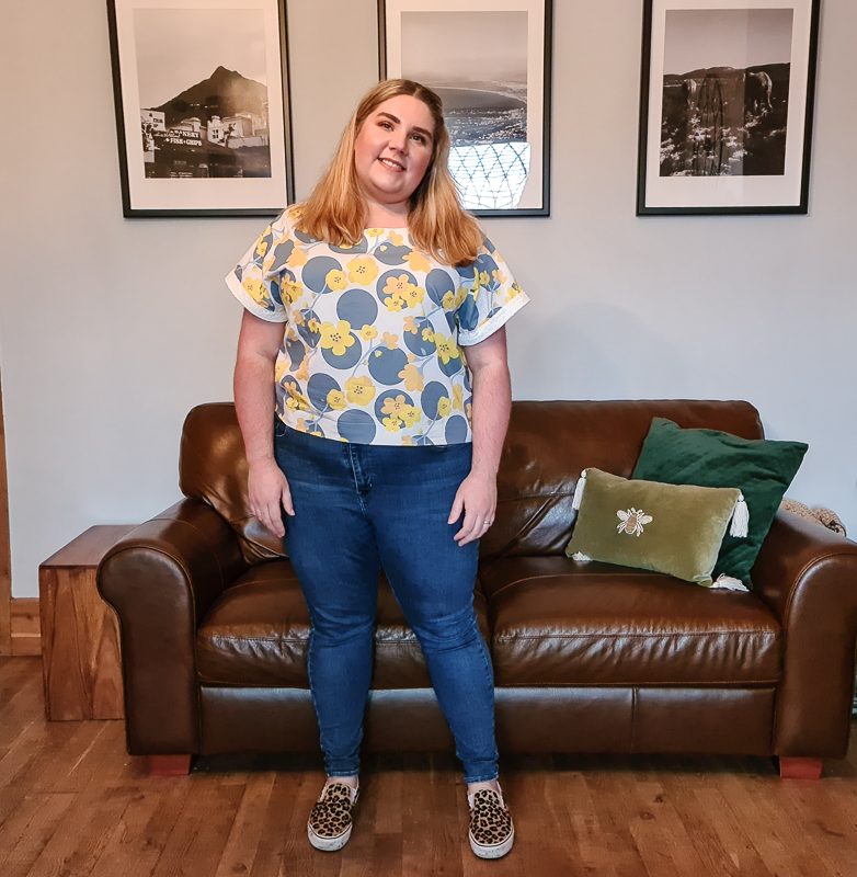 This month Laura received the Mini box and turned her beautiful yellow and grey flower spot cotton poplin into a Closet Core Cielo Top.