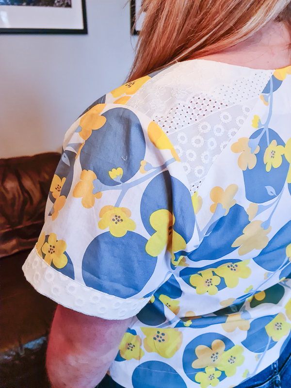 I wanted to take advantage of this and coordinated the shoulder yokes and cuffs with some tiny scraps of broderie anglaise left over from another project. I think it matches perfectly with the circles in the print.