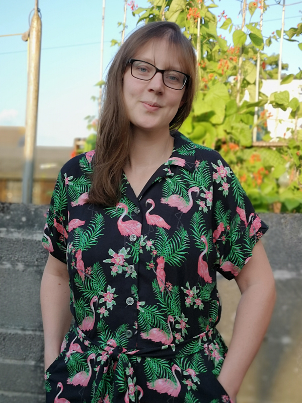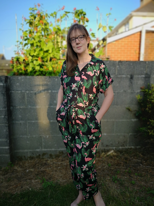 The fabric is a viscose from Lady McElroy and has such a lovely drape yet still some weight to it making it ideal for a jumpsuit. I’m not one for bright patterned fabric so this one was perfect for me as the fabric is covered in flamingos, leaves and flowers but on an unusual dark background. I think that’s one of the good things about Hayleys subscription box, as I would not have thought to try this fabric but I love what I’ve ended up making.