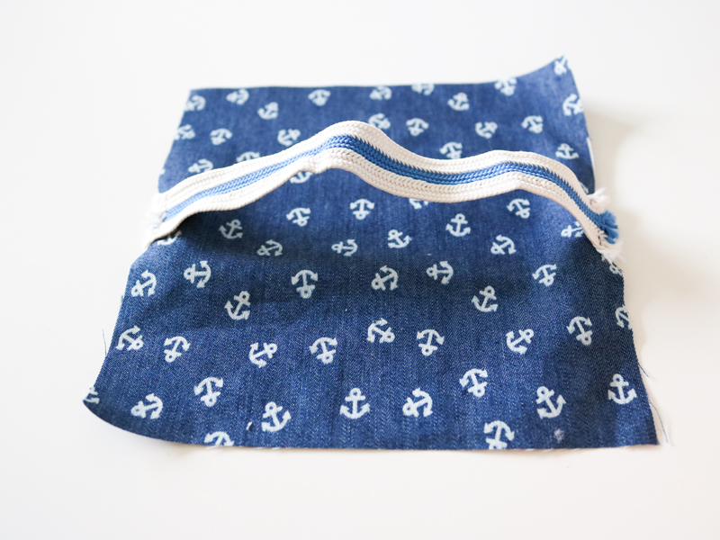 Take the ribbon or trim that you want to use on the handle, for this is used a piece of trim that went into the SewHayleyJane boxes waaay back in March. Lay it on top of one of the square pieces of fabric, making sure it is in the centre and matching up the edges. Stitch in place.
