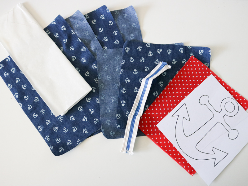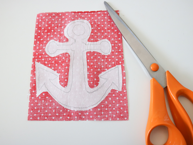 To make the anchor piece, print off the template and, laying a piece of iron-on adhesive over the top, trace around the shape. Roughly cut around the shape and following the manufacturers instructions iron onto the wrong side of the contrast fabric.
