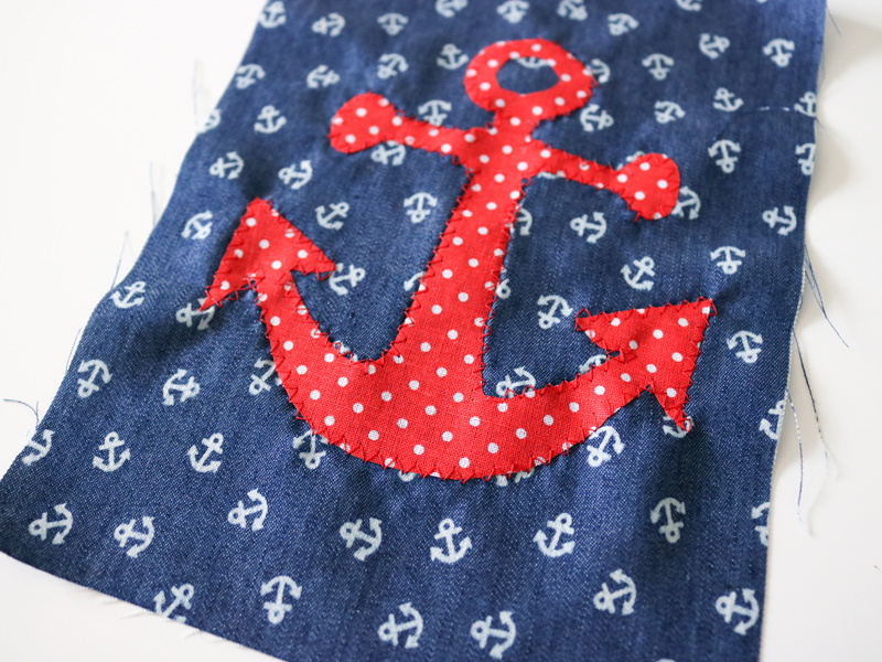 Cut the shape out along the lines the peel off the backing paper. Centre the anchor onto the right side of one of the rectangular pieces and, again following the manufacturers instructions iron into place.
