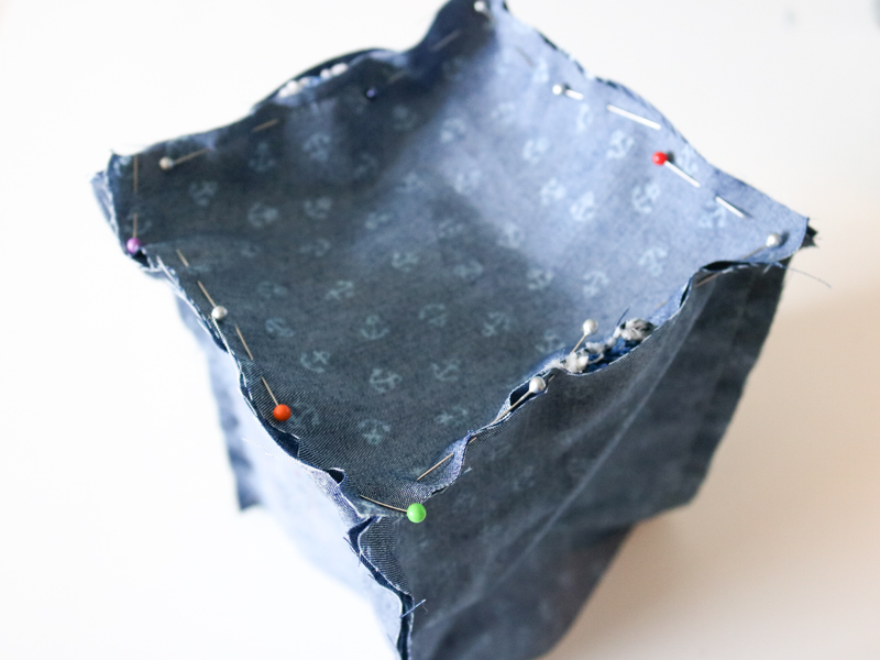 Pin the finished top to the sides, so that the right sides of the cube are all facing inwards. Stitch in place, taking it easy around the corners so that you are not catching any extra fabric underneath. If you want you can trim the edges with pinking shears.