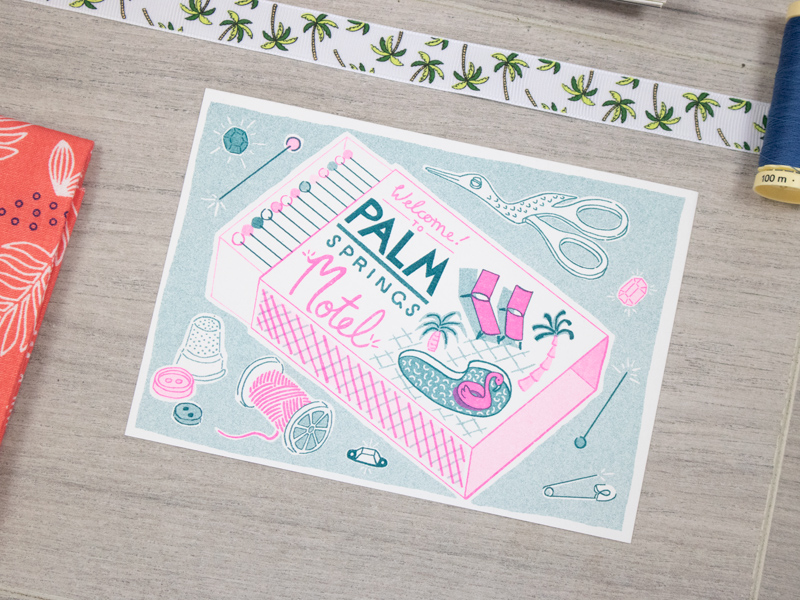 They also got in contact with Jacqueline Colley who they met at the Mollie Makes awards. Jacqueline is an illustrator and pattern designer who set to creating us an exclusive print to fit the theme – Palm Springs!!! The Matchbox Motel print was based on a design she already had but of course we “stitched it up” a bit by substituting the matchsticks for sewing pins and added other amazing sewing bits to the design too. I am in love with the finished design and can’t wait to get a frame and to add it to my sewing gallery wall!