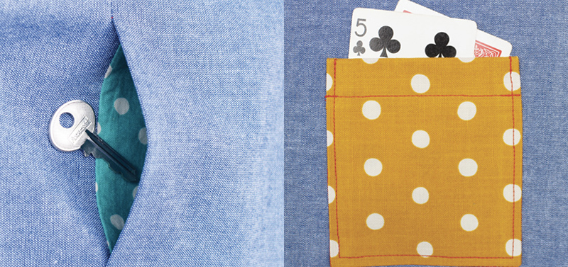 Alternatively use them to make a patch pocket. I’ve seen some great examples of this being done. If you don’t want your pocket to stand out too much, use the contrasting fat quarter to line the patch pocket, again a sneaky little flash of something brightly coloured and extra pretty to make you smile.