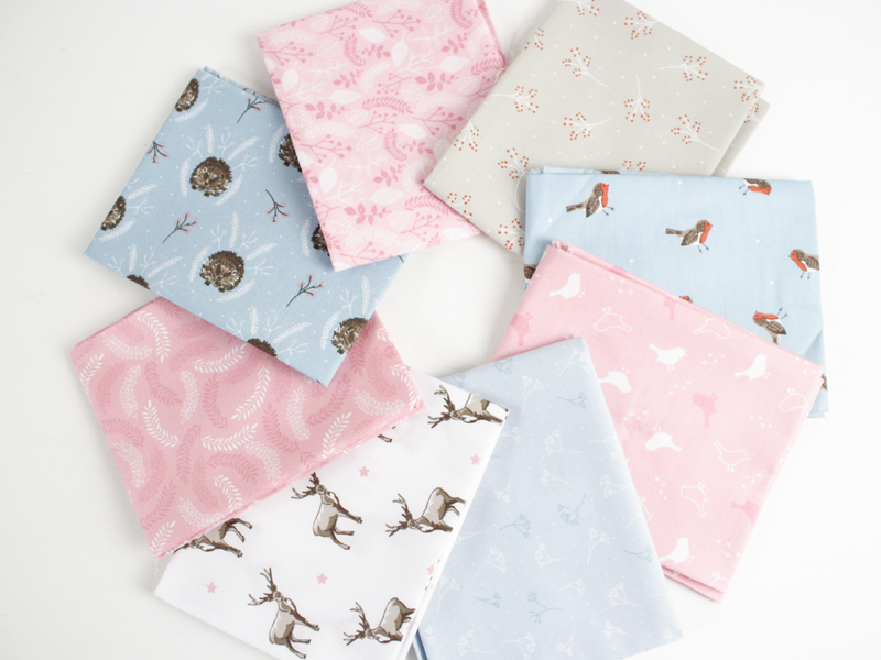 This months Fat Quarter selection are all about the frosty colours of pale blues and pinks and fun little winter woodland animals, robins, hedgehogs and of course reindeer!! I love this selection so much. We discovered that we have a hedgehog nesting somewhere in our garden, we saw him every now and then snuffling around the garden a few months back so hopefully he’s snuggled down fast asleep… jealous much!!