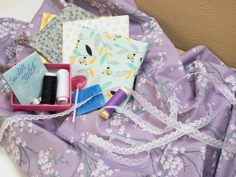 The fabric included in these boxes is the most gorgeous mauve blossom print cotton poplin which is perfect for making skirts and dresses for a summer wedding. Poplin can work for both full and fitted skirts and makes a great close fitting bodice. I love the blossom print on this fabric, it’s so pretty.