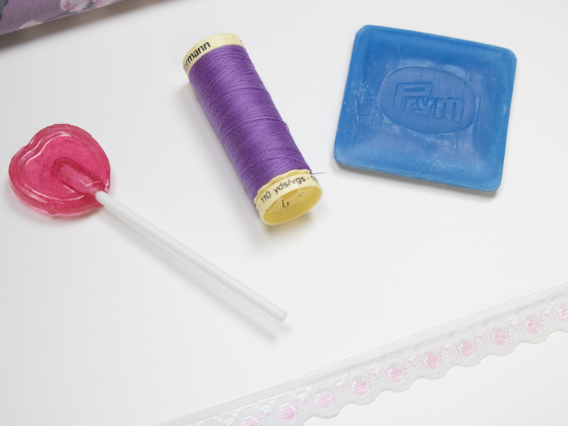 As well as the usual Gutermann thread each box includes 2 meters of a beautiful white and pink lace trim, dressmakers chalk and a heart lolly.