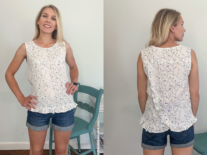 Then Esthers most recent make for January was the Helen’s Closet Gilbert Top. Esther made hers without sleeves and used a fat quarter from the boxes to make the inside back yoke piece which gives a super cute touch, especially if you use a fabric that makes you smile as you put it on in the morning!