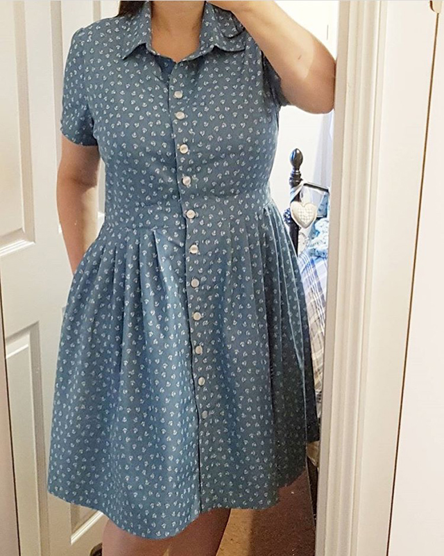 From June’s “Anchors Away” box, Sarah has made this lovely shirt dress using McCall’s M6696. I love the pleat detail on the skirt to give it it’s fullness.